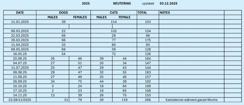 3 – 4 Veterinäre kastrieren pro Monat zwischen 150 und 250 Strassenhunde. Mit einer Spende von 30.– CHF/€ pro Behandlung können wir einen Strassenhund kastrieren und impfen. So werden durch uns rund über 2 500 Hunde jedes Jahr kastriert mit einem finanziellen Aufwand von rund 60 000 CHF/€.